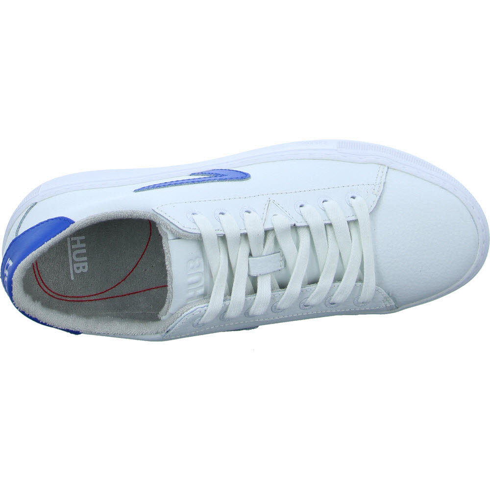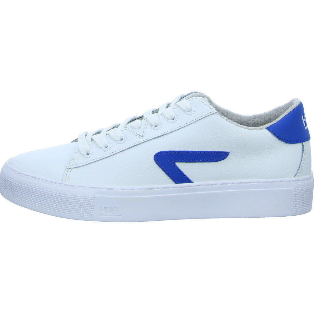 wobei die untere Hälfte des Logos orangefarben lackiert ist. Dieser Hook ist aus weißem Leder gefertigt. Original HUB-Logos befinden sich auf der Rückseite und auf der Zunge des Schuhs.