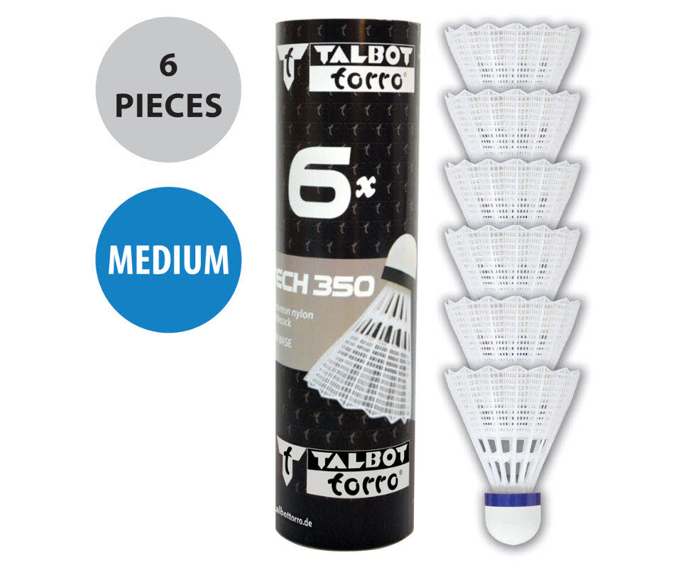Der Tech 350 der bekannten deutsch-britischen Marke Talbot-Torro ist ein haltbarer Nylonfederball mit Fuß aus synthetischem Kork. Er ist besonders für den Freizeitsport, das Training oder die Schule geeignet, aber auch als hochwertigerer Ersatzball zu Freiluft-Federballsets. Der Ball verfügt über gute Flugeigenschaften. Es sind 6 weiße Bälle in mittlerer Geschwindigkeit (Blau) in einer Dose. Die Geschwindigkeit ist durch die entsprechende farbliche Markierung am Federball-Kopf zu erkennen. Hier ist eine farbliche Banderole angebracht.