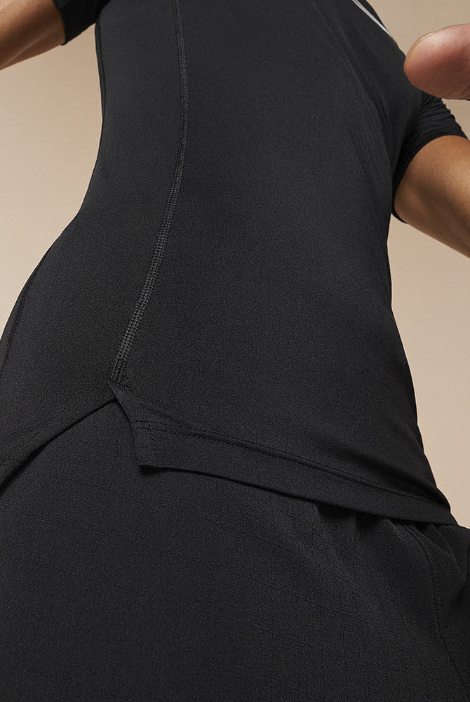 Leichtes, elastisches Material mit Belüftungsschlitzen am Saum sorgt für natürliche Bewegungsfreiheit bei intensiven Sets.