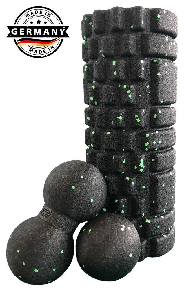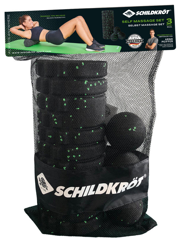 Das neue innovative Schildkröt Fitness Selbstmassage Set besteht aus 3 Geräten zur gezielten Massage aller Körperregionen sowie gezieltem Faszientraining. Im Set enthalten ist eine Faszienrolle (Ø140mm, Länge 330mm) die sich zur Behandlung großer Körperpartien eignet, ein Duo-Ball (Ø80mm, Länge 160mm) zur gezielten Anwendung an kleineren Bereichen wie Rücken und Nacken und ein Massageball (Ø80mm) um schwer zugängliche Körperstellen zu erreichen. Konzipiert wurde das Set um optimal Verspannungen zu lösen und Schmerzen zu lindern. Gefertigt sind die Geräte aus stabilem EPP Schaumstoff, der trotz seines geringen Gewichtes höchst belastbar ist. Das Material ist schmutz- und feuchtigkeitsabweisend sowie rutsch- und abriebfest. Verpackt sind die 3 Teile in einer praktischen Netztasche für den erleichterten Transport. Made in Germany!