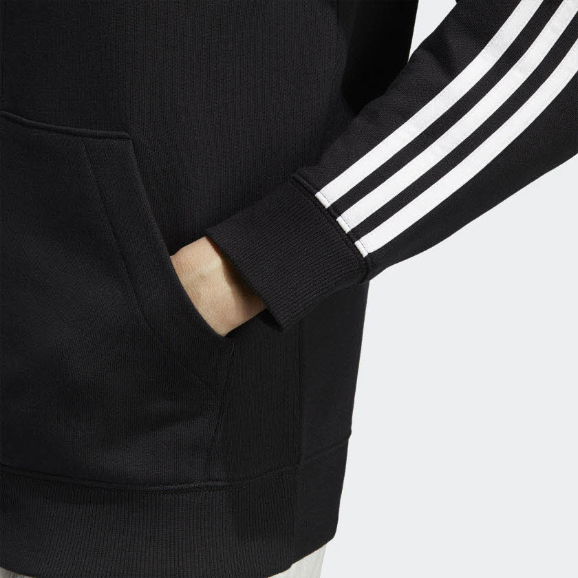 EINE KLASSISCHE ADIDAS KAPUZENJACKE MIT WEITENREGULIERBAREM KORDELZUG.