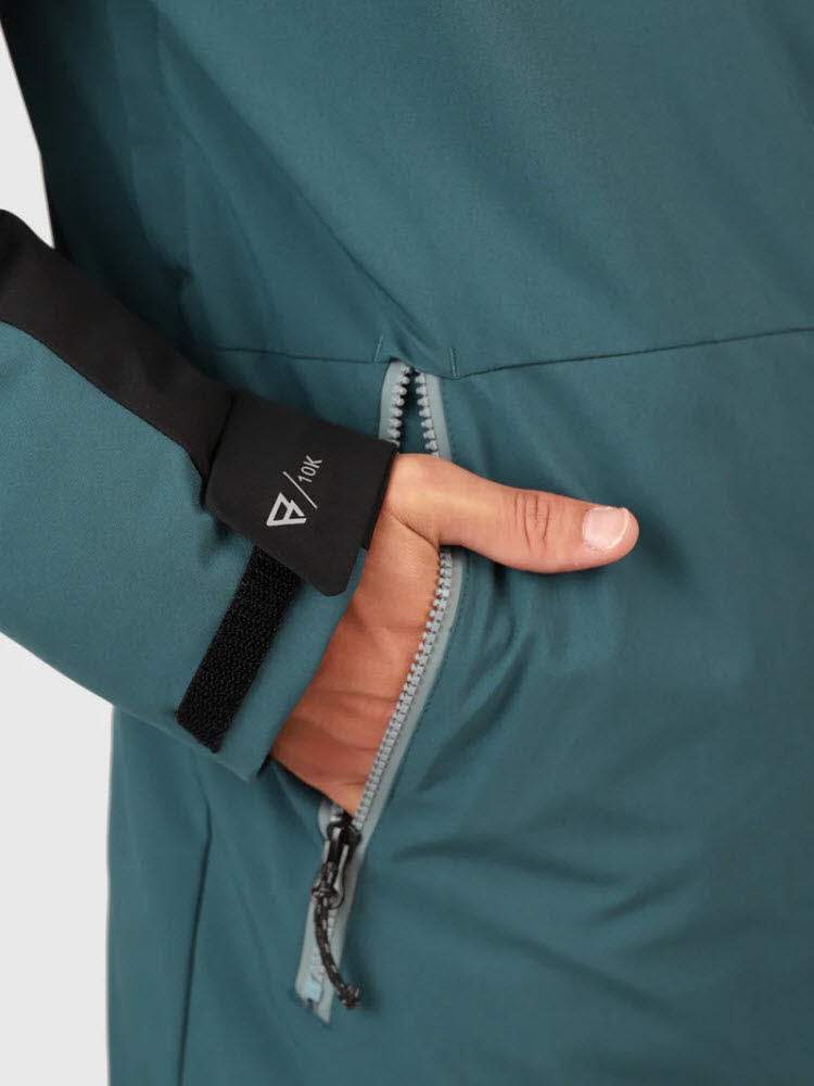 Eigenschaften Wasserabweisend bis 10K Winddicht Atmungsaktiv 8K 4-Wege-Stretch Recycelte Wattierung Verschweißte Nähte an wichtigen Stellen Verstellbare Bündchen Lycra Ärmelmanschetten Vorgeformte Ärmel Anti-Slip Schneefang Belüftungreißverschlüsse Goggle/Brillenputz-Tuch Schlüsselclip in Innentasche Tasche für Skipass Audio Pocket mit Kopfhörerausgang Feste Kapuze Verstellbarer Saum Wasserdichter YKK-Reißverschluss Verstellbare Kapuze Recycelte Materialien Geklebte Details PFC frei Regular Fit