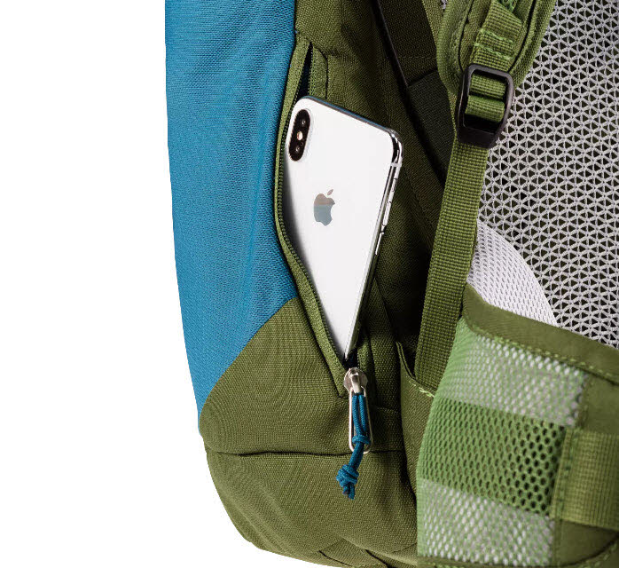 Smartphone oder Snacks lassen sich griffbereit in der elastischen und luftigen Seitentasche verstauen.
