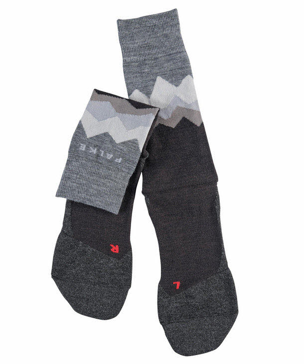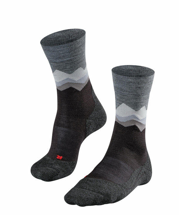 Durch die in den Schaft eingearbeitete Bergsilhouette in verschiedenen Farbschattierungen ist die Wandersocke ein echter Hingucker.