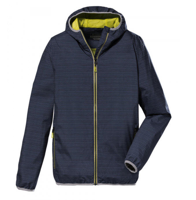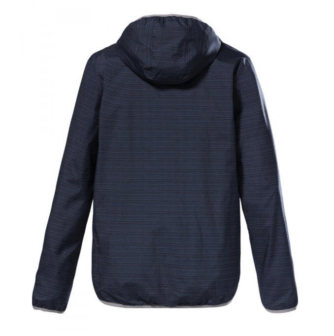 Die leichte Funktionsjacke von killtec fällt durch ihren All Over- Streifenprint und die farbig abgesetzten Reißverschlüsse auf.