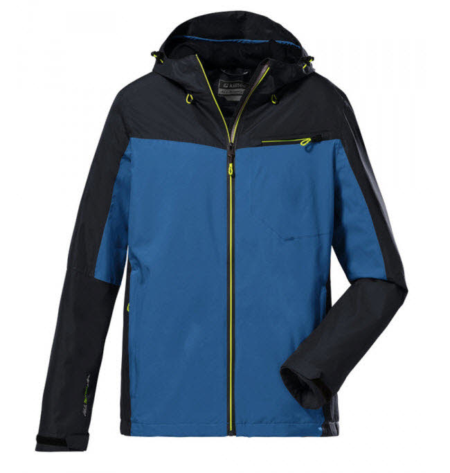 Die leichte Funktionsjacke von killtec fällt durch ihr Colourblock Design und die farbig abgesetzten Reißverschlüsse auf.