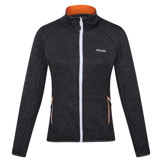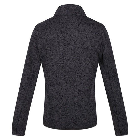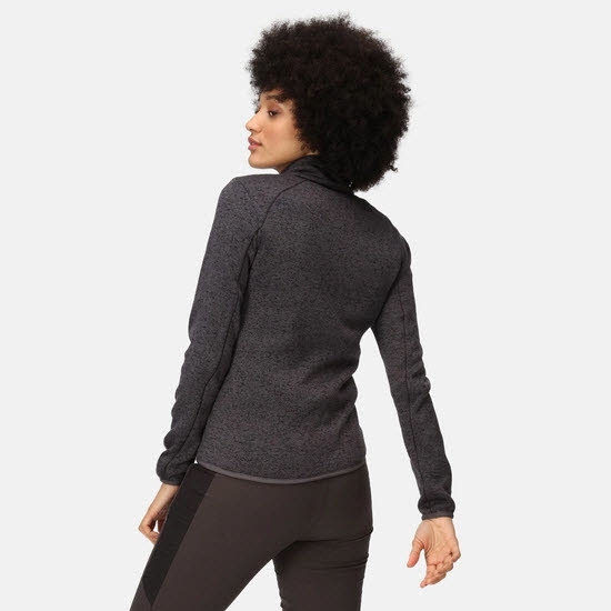 Das Damenfleece mit Reißverschluss besteht aus einem melierten, recycelten Fleecegewebe in Strickoptik