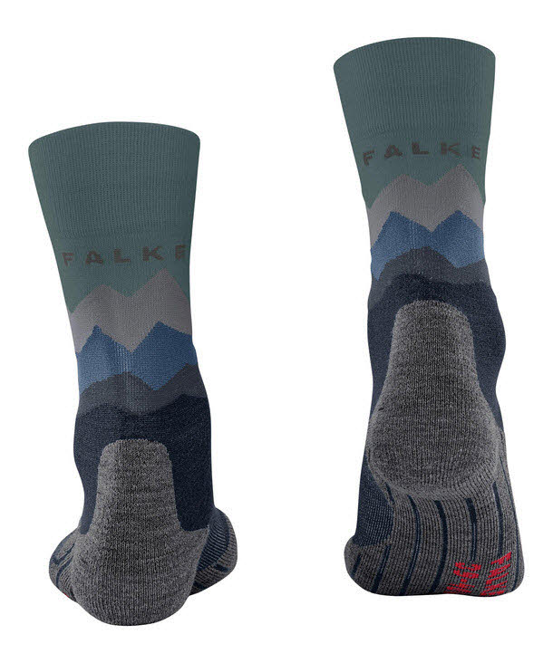 Durch die in den Schaft eingearbeitete Bergsilhouette in verschiedenen Farbschattierungen ist die Wandersocke ein echter Hingucker.
